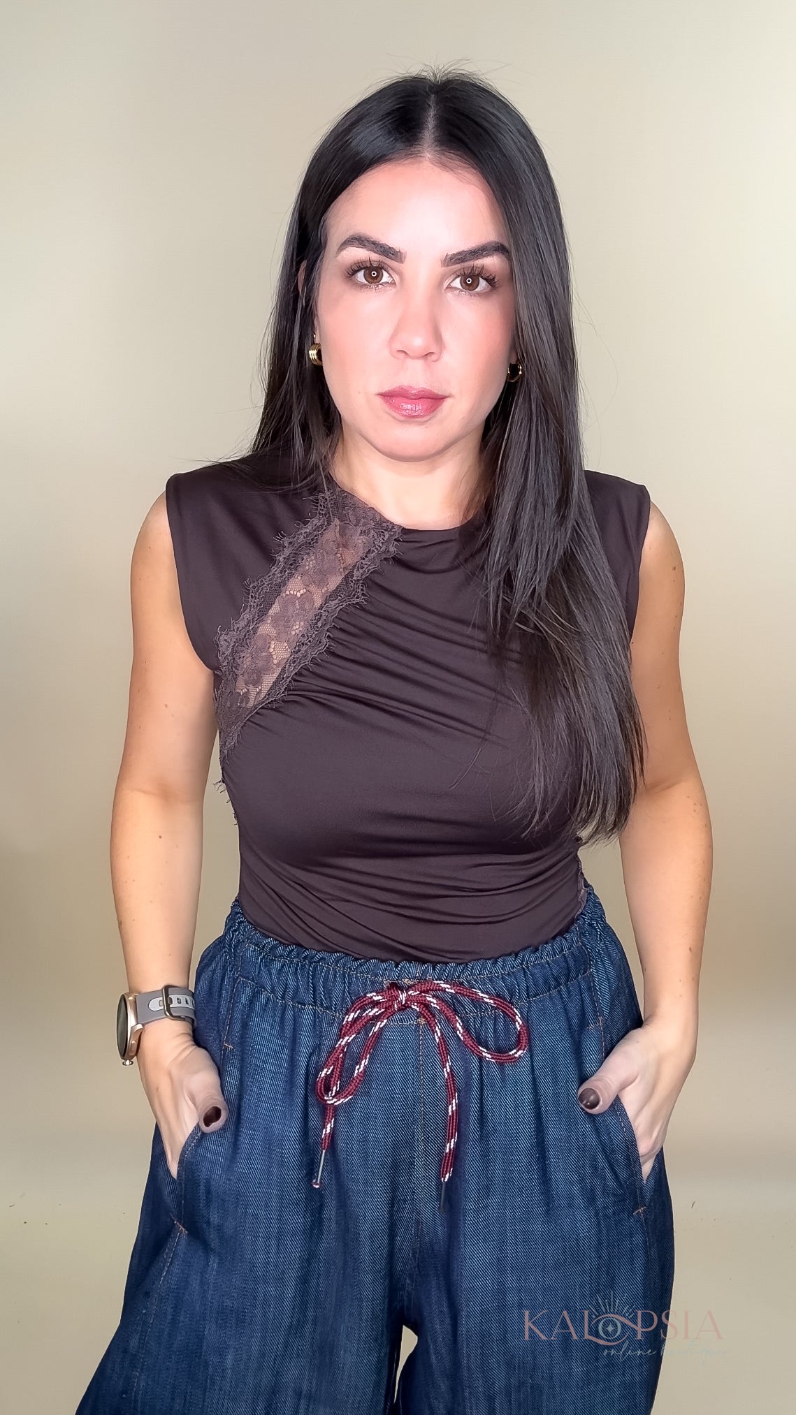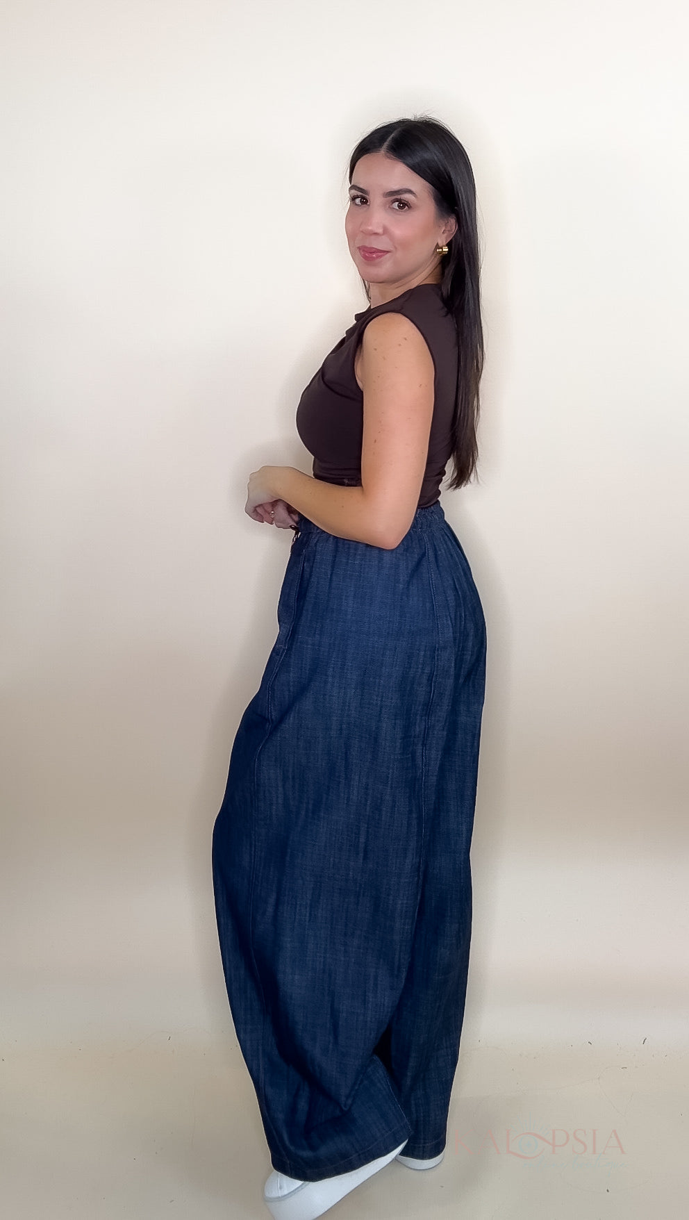 No spandex and elastic waist. Model measurements are: Waist: 30 inches and Hips: 38 inches.